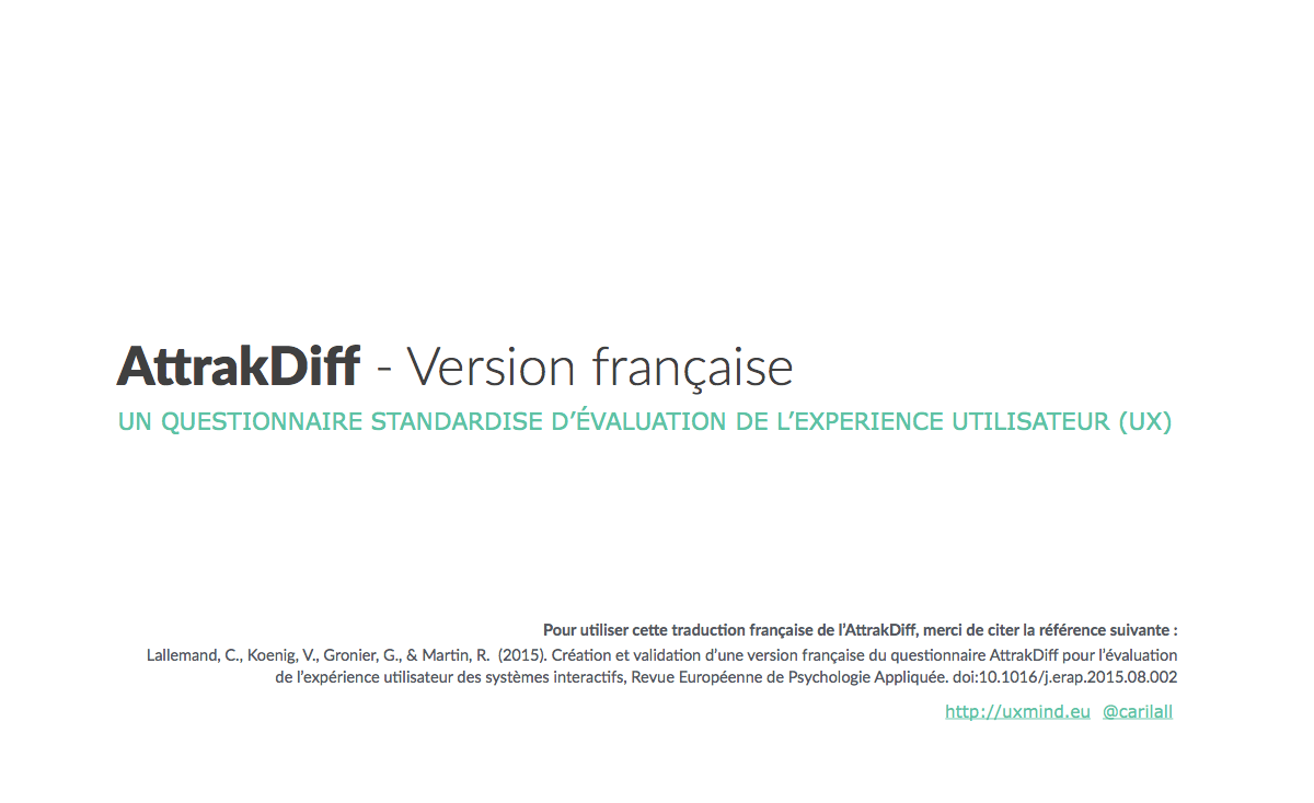 Référence FR : Lallemand, C., Koenig, V., Gronier, G., & Martin, R. (2015). Création et validation d’une version française du questionnaire AttrakDiff pour l’évaluation de l’expérience utilisateur des systèmes interactifs. Revue européenne de psychologie appliquée.